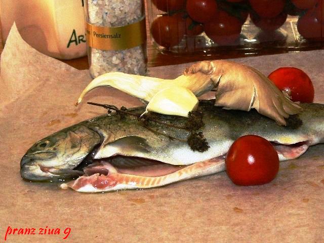 L-am pus pe hartie pergament,unsa cu ulei,l-am parfumat cu o crenguta de cimbru si am pus langa el 2 rosioare,un catel de usturoi si o ciupercuta.Sare si piper.