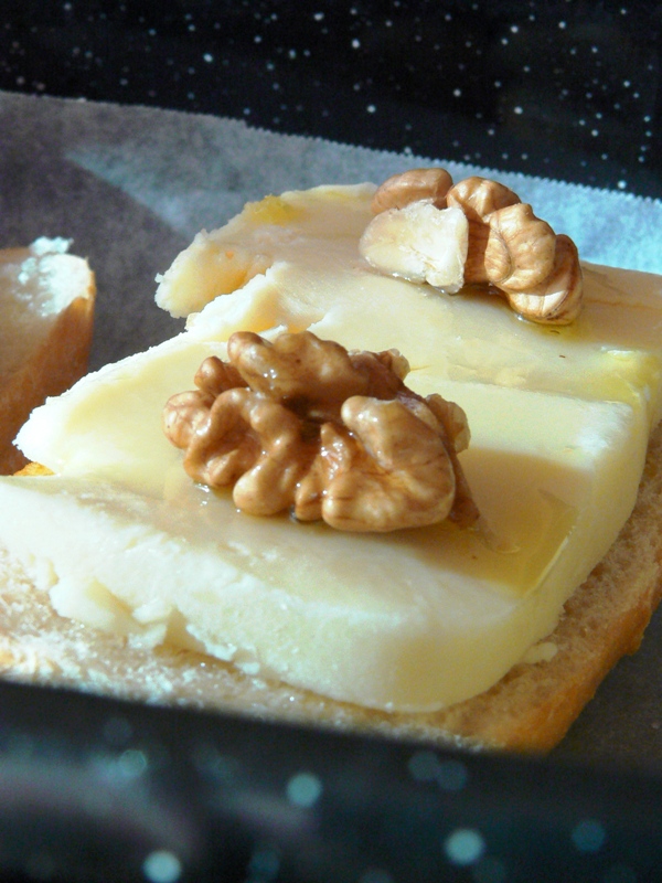 Intre timp,ungem feliile de paine cu ulei de masline,punem pe fiecare cate o felie de cascaval si 2 samburi de nuca.Se dau la cuptor pana cand branza se topeste .